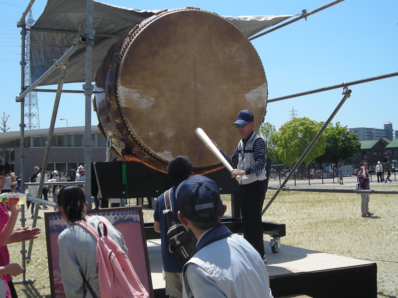 一魂一打して思いを伝える太鼓、”なにわ最大”の打面6尺5寸(約195cm)募金大太鼓 「縁」の製作をすすめ、2014年9月7日に「第4回和音際」会場にて初披露。